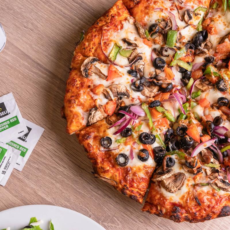 Individual 7" $12.99 | Small 10" $18.99 | Medium 12" $23.99 | Large 14" $29.99 | X - Large 16" $34.99 • Tomatoes, bell peppers, onions, mushrooms, olives, red sauce.
