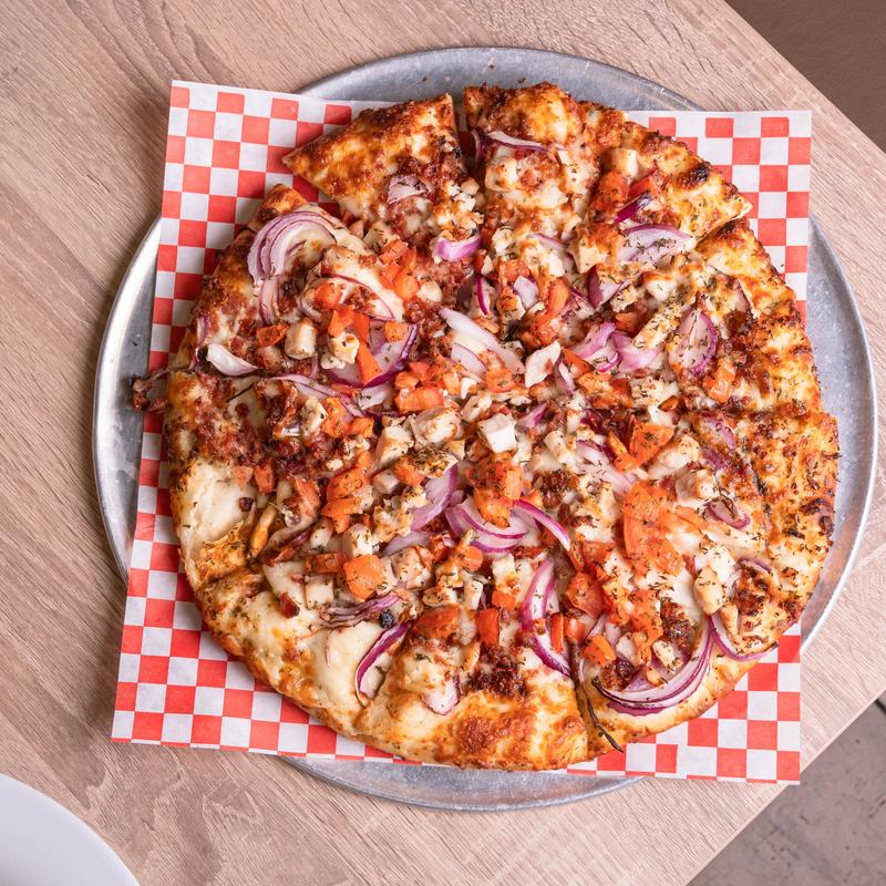 Individual 7" $12.99 | Small 10" $18.99 | Medium 12" $23.99 | Large 14" $29.99 | X - Large 16" $34.99 • White sauce, chicken, bacon, red onions, and tomatoes.